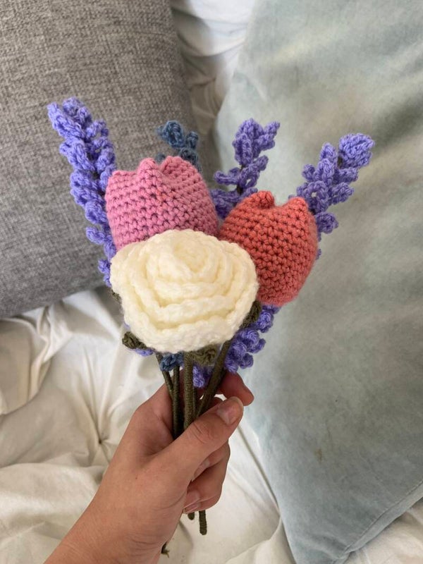 Made from 100% acrylic yarn. The lavender is about 24 cm long. The tulip is about 21 cm long. The rose is about 19 cm long. Not my pattern, the pattern is from Ally Newbry on YouTube.