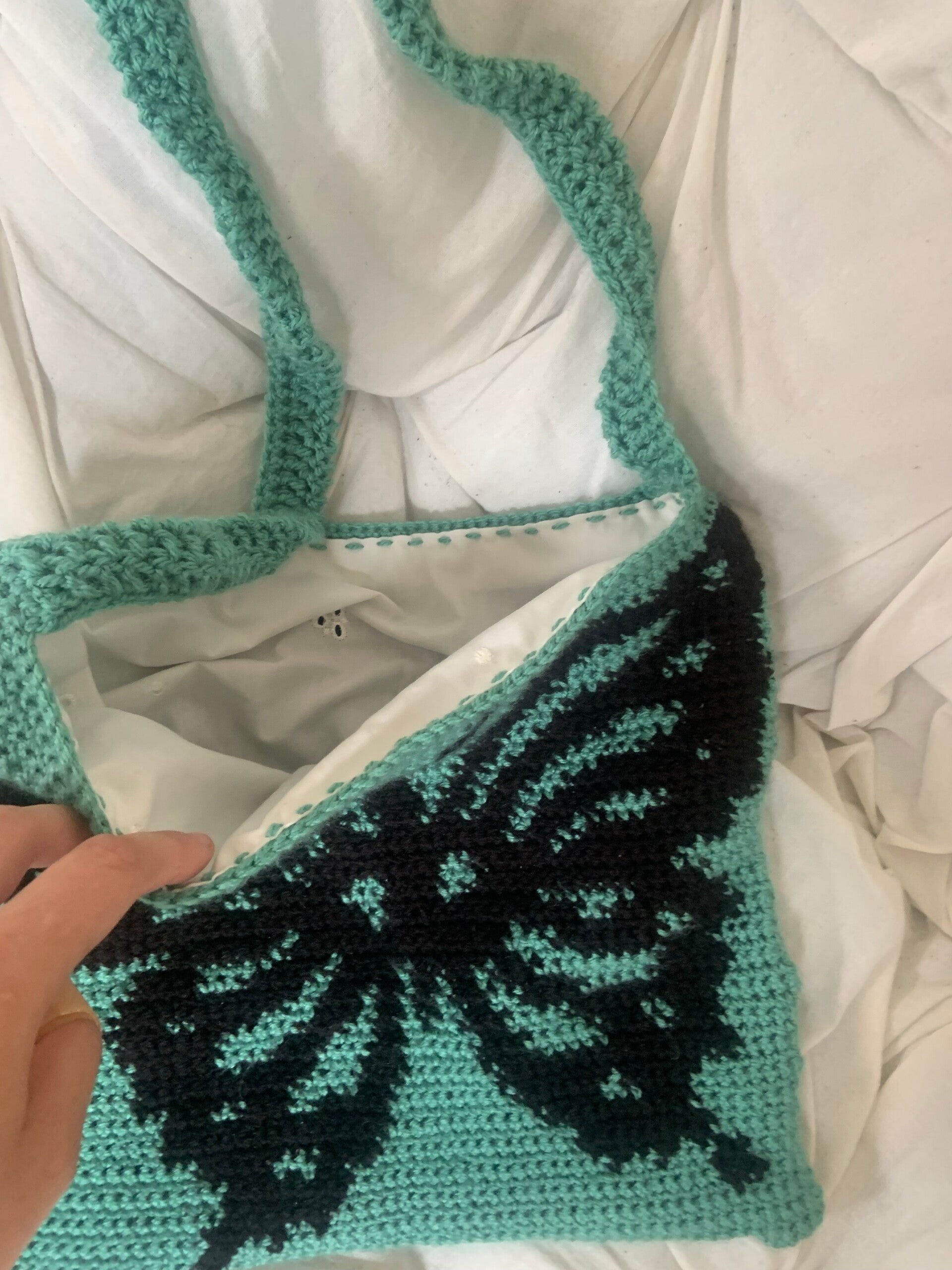 Made from 100% acrylic. That bag is about 26 cm deep and 32 cm wide. If you choose to wash this bag, wash it gently by hand in cold water and lay it flat to dry. Don't put things in the bag that are to heavy. The bag has a lining.